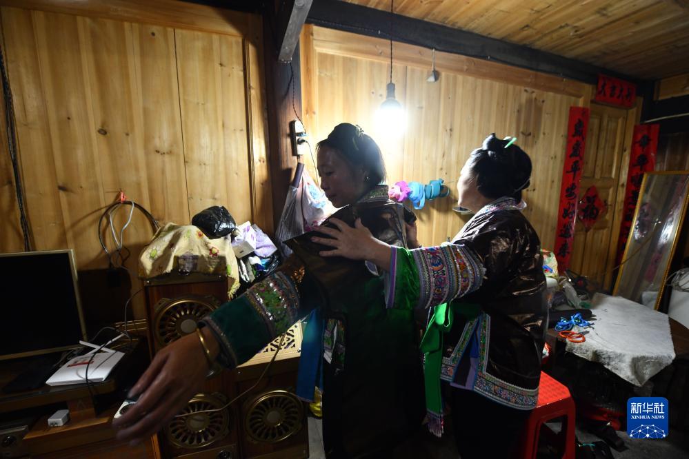 乌英苗寨妇女梁足英(左)、吴妹秋准备缝制亮布衣服,这是吴妹秋在给梁足英量身(2023年8月31日摄)。新华社记者 黄孝邦 摄
