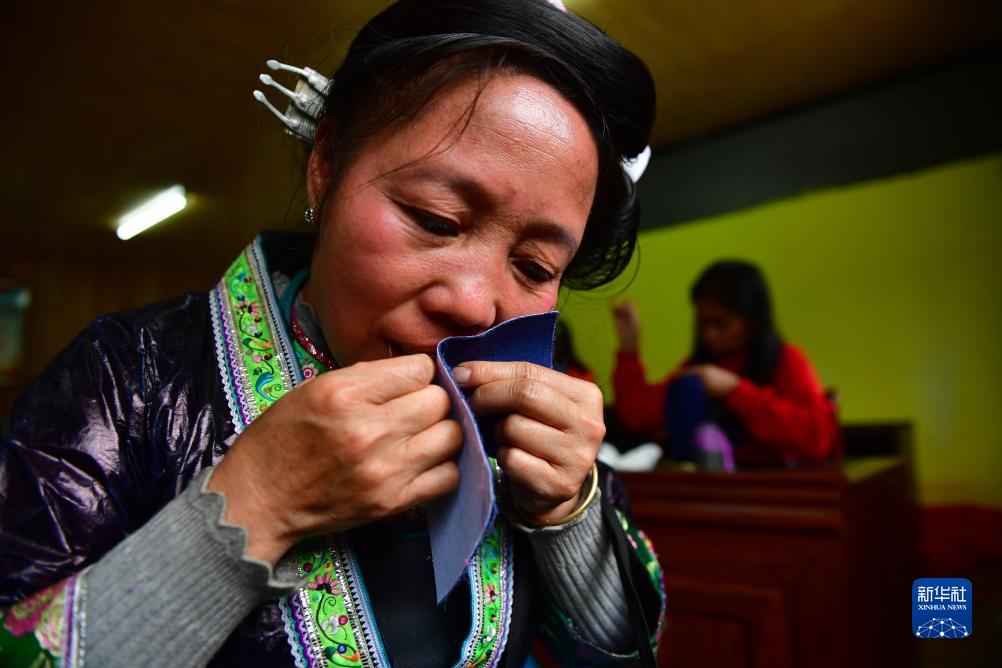 乌英苗寨妇女梁足英在刺绣(2019年10月19日摄)。新华社记者 黄孝邦 摄
