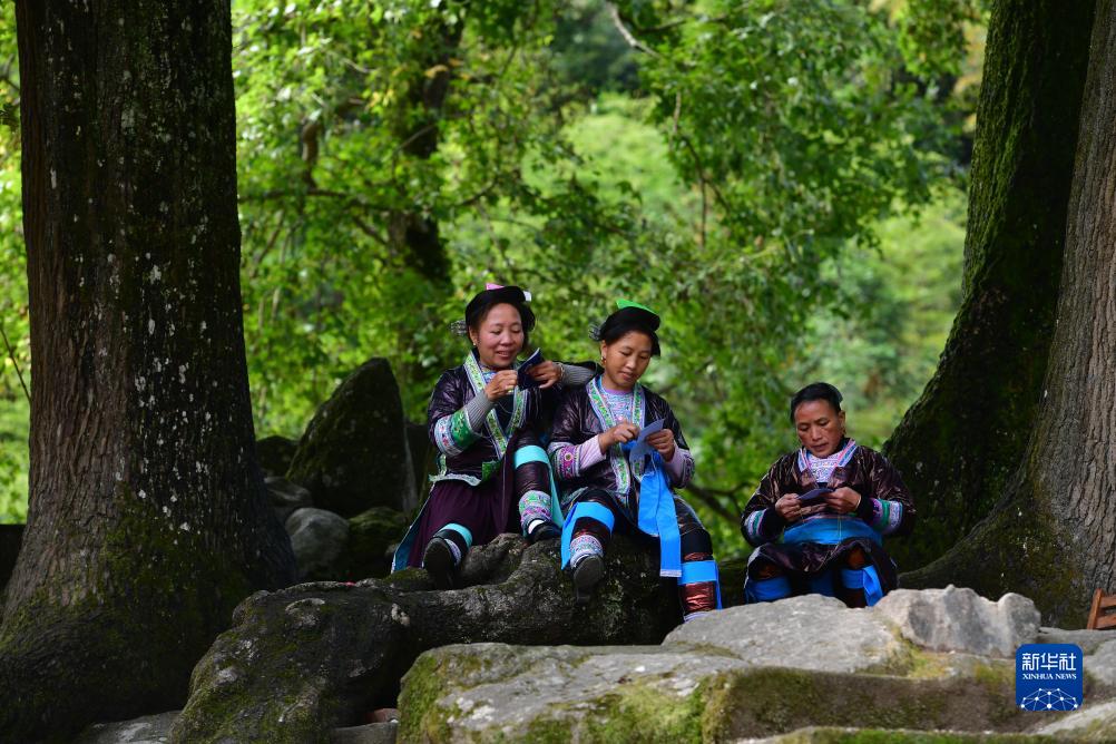 乌英苗寨妇女梁足英(左一)在刺绣(2019年10月18日摄)。新华社记者 黄孝邦 摄