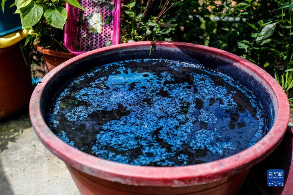 这是乌英苗寨妇女梁足英用山泉水浸泡蓝靛草三天后,药水呈现的颜色(2023年8月31日摄)。新华社记者 胡星宇 摄