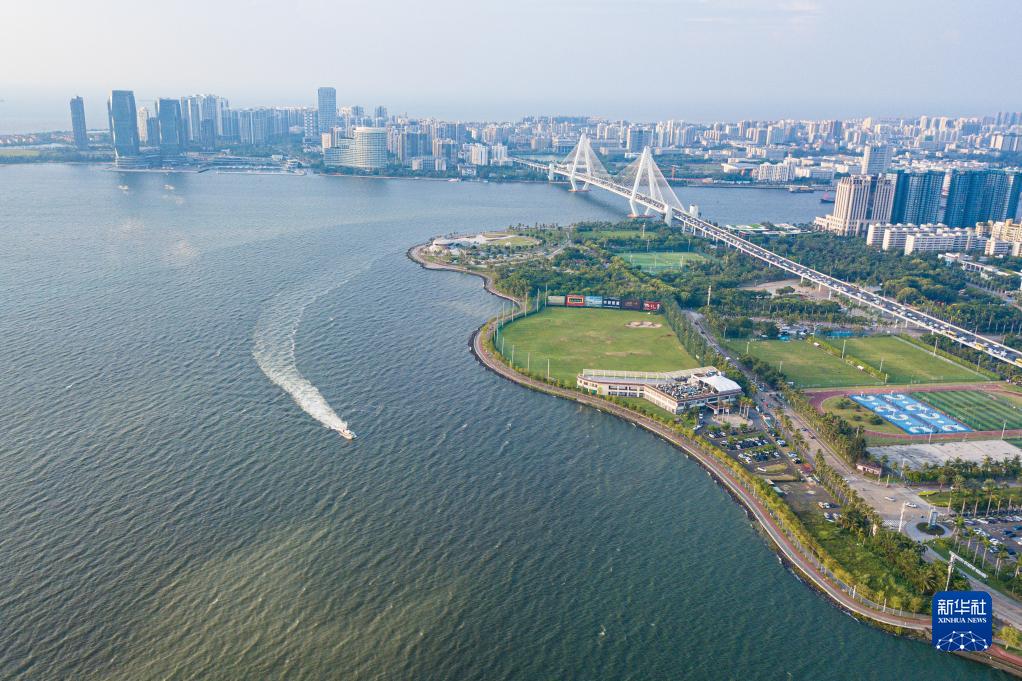 9月1日在海南省海口市拍摄的海口湾景色(无人机照片)。海口湾位于海南省海口市中心区,海湾面积268.2平方千米,打造了“椰风海韵、湾城融通”的海湾景观,是海口市发展的重要依托和生态名片。