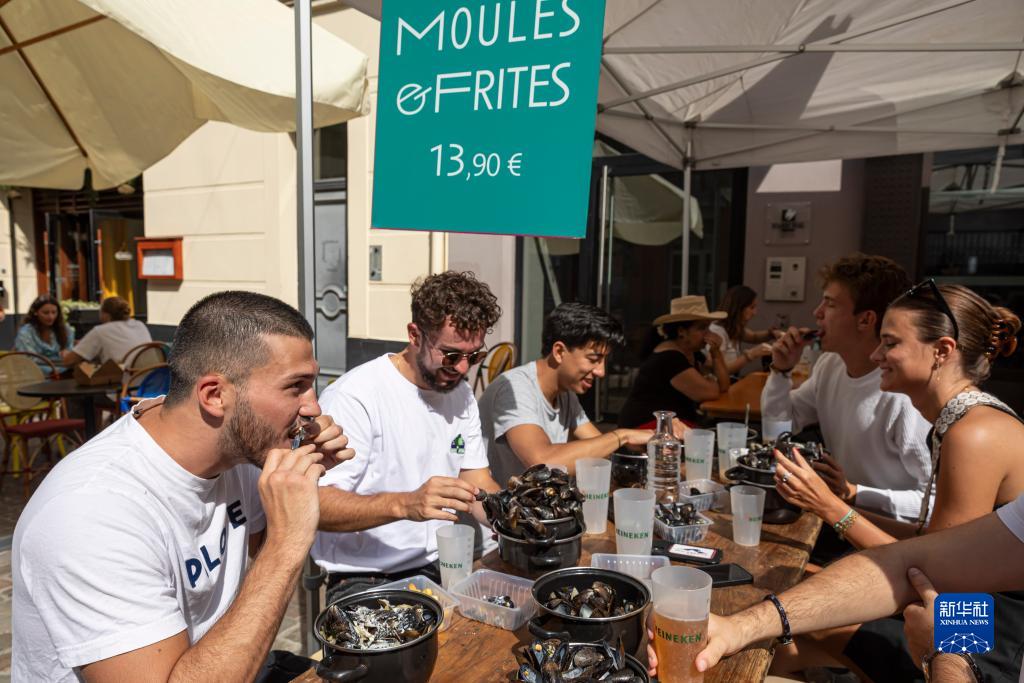 9月3日,在法国里尔旧货市场上,人们享用贻贝和啤酒。