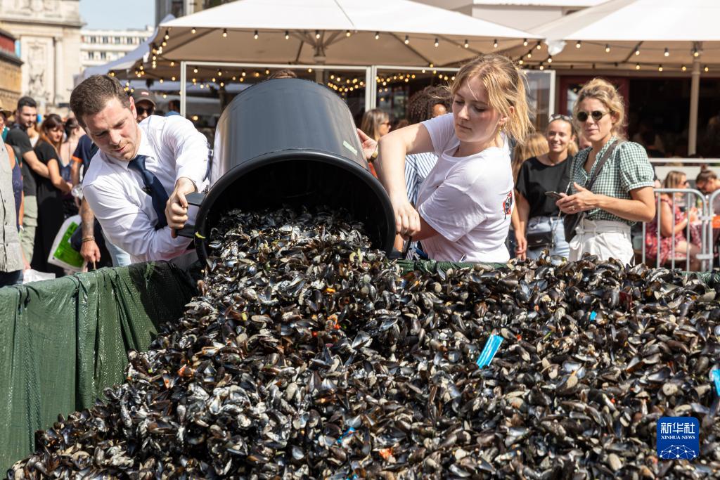 9月3日,在法国里尔旧货市场上,工作人员倾倒顾客就餐后留下的贻贝壳。