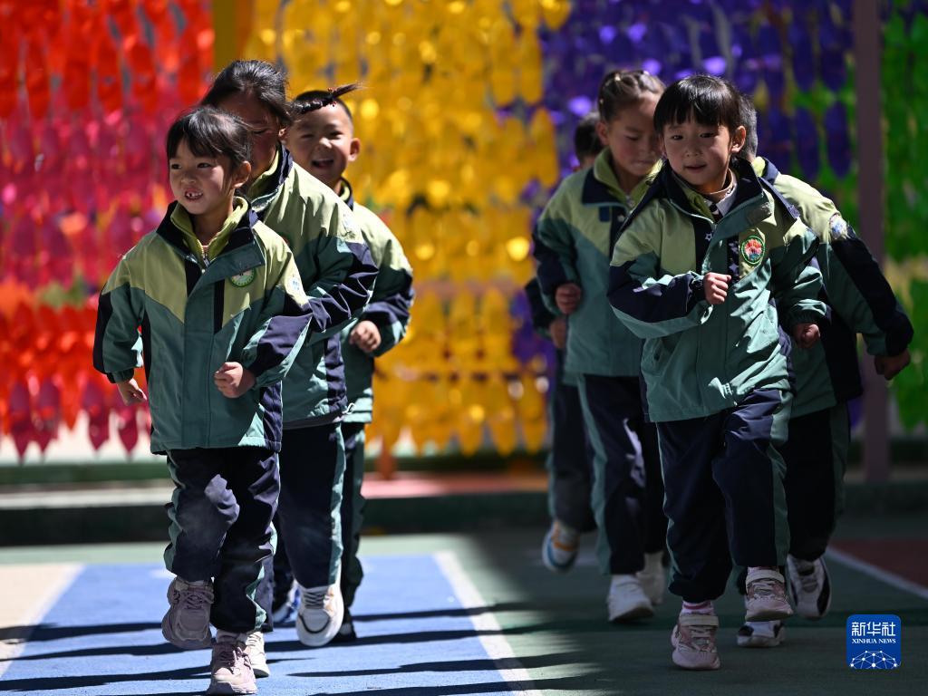 9月4日,青海省果洛藏族自治州玛沁县大武幼儿园小朋友在体育课上跑步。