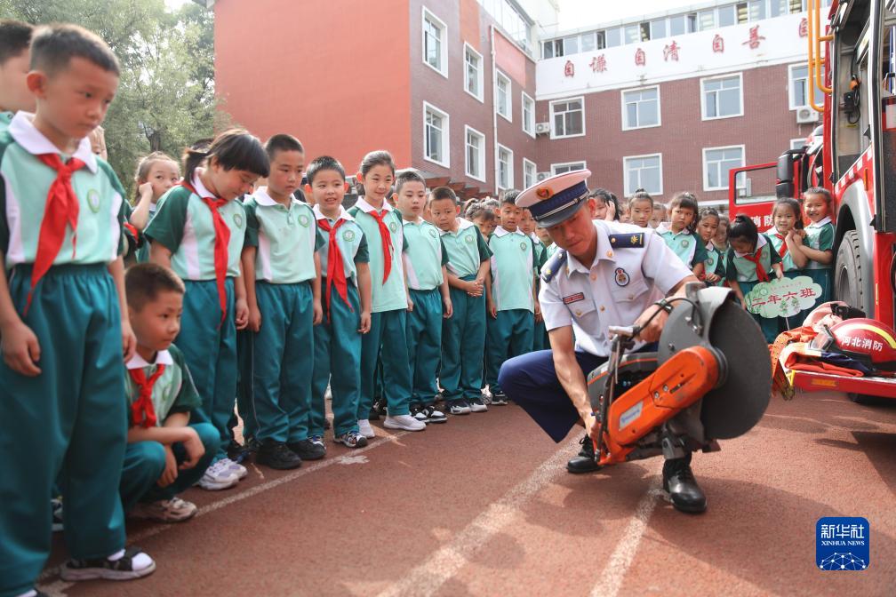 9月4日,在承德市双桥区竹林寺小学,消防救援队员为学生们讲解消防器材的使用方法。