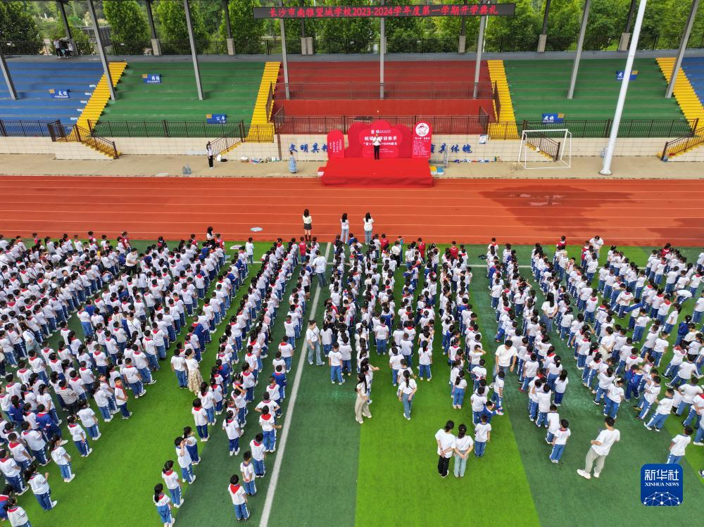 9月4日,在长沙市南雅望城学校,学生在参加开学典礼(无人机照片)。