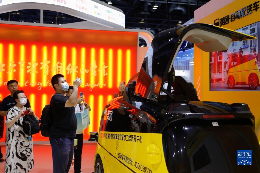 9月4日,在2023年服贸会国家会议中心美团展台,观众参观一款自动配送车。