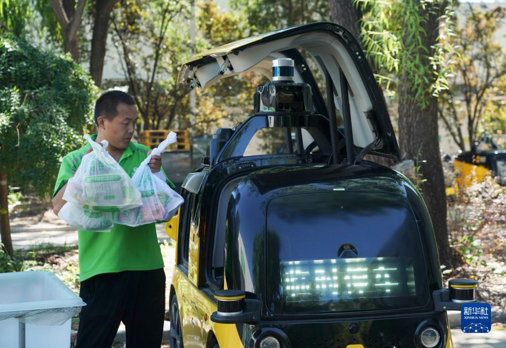 在北京市顺义区,一辆辆自动配送车有序行驶在道路上。顾客下单后,工作人员将订单放入自动配送车中,这些车辆根据规划好的路线,自动驾驶到指定停车点位,用户可通过手机验证码等方式取出订单,或者通过骑手在停车点拿取订单并配送到顾客手中。