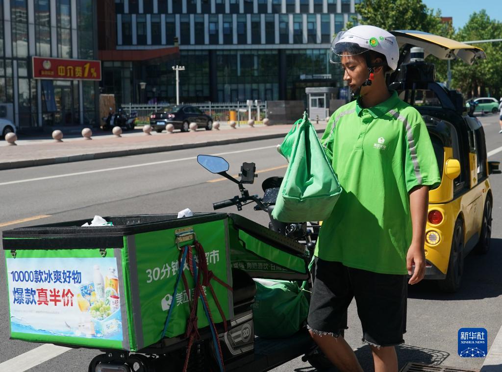 在位于北京市顺义区的一处自动配送车指定停靠点,一名骑手取走自动配送车中的订单准备送至顾客手中(8月22日摄)。