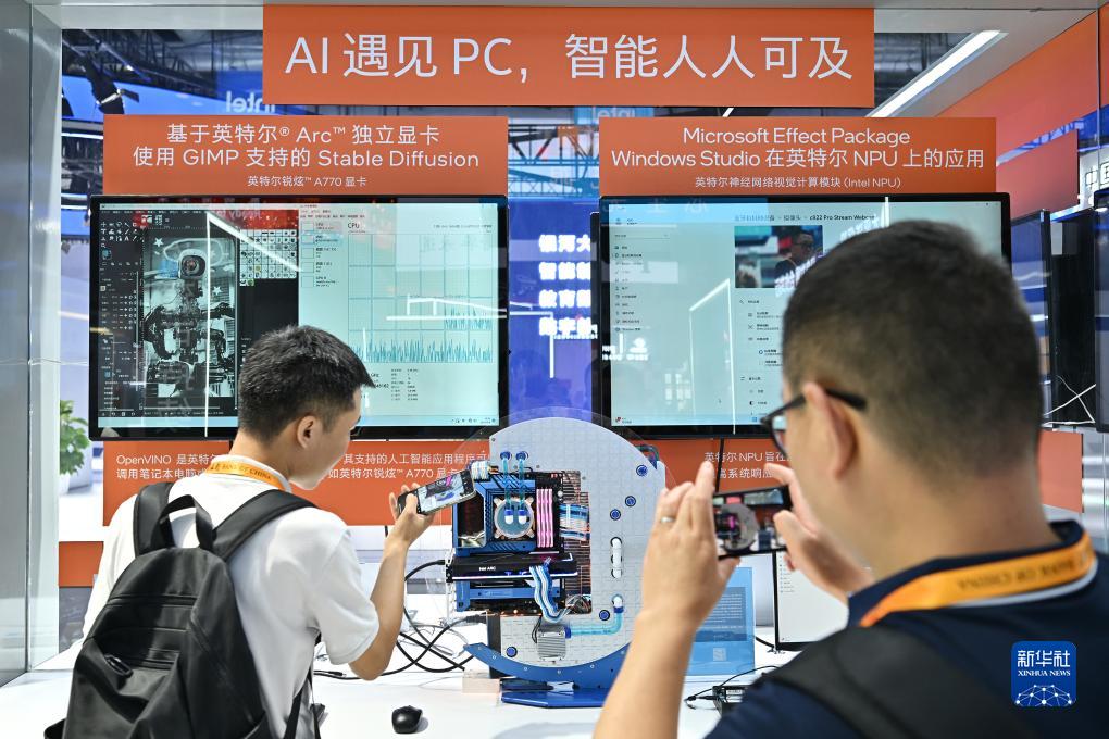 9月4日,两名参观者在服贸会国家会议中心的英特尔展台拍摄一款独立显卡。