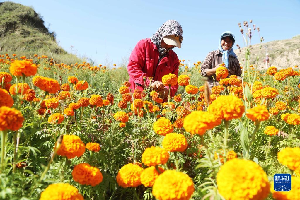 9月4日,农民在甘肃省定西市陇西县马河镇贺家川村采摘万寿菊。