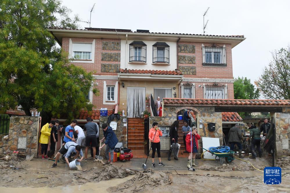 9月4日,居民在西班牙马德里比利亚曼塔镇清理淤泥。