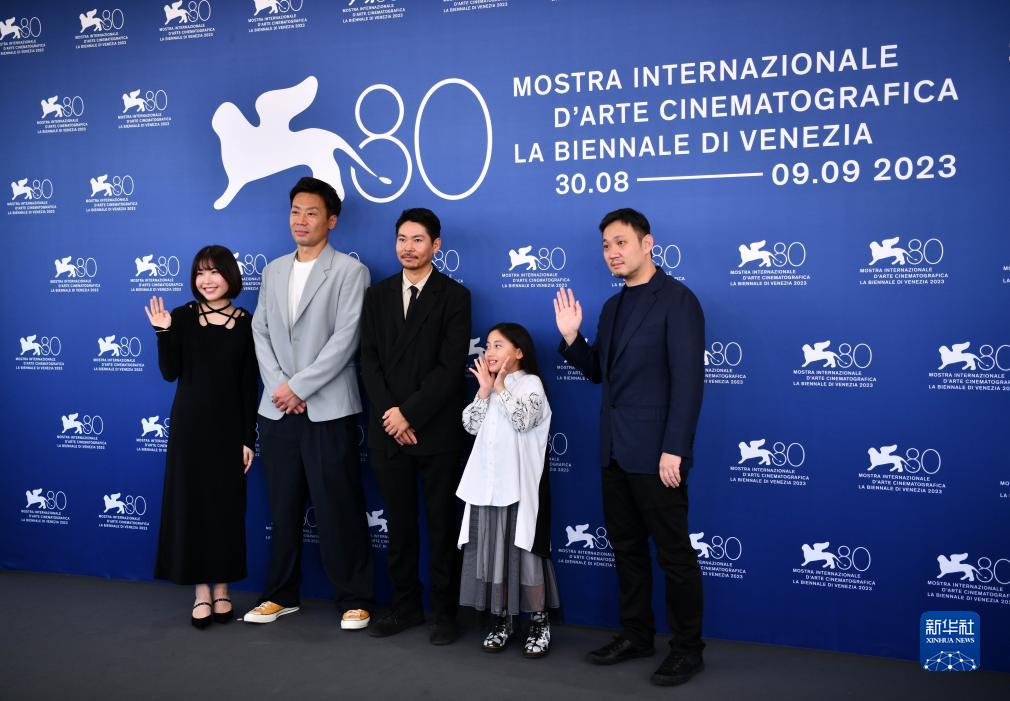 9月4日,电影《邪恶不存在》导演滨口龙介(右一)携主创人员出席意大利威尼斯电影节拍照式。