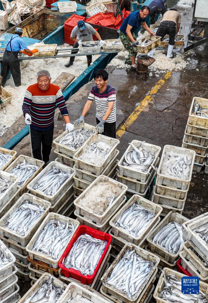 当日,山东省荣成市成山镇落凤渔港一派繁忙景象,秋捕归来的渔船满载而归,靠港卸鱼。