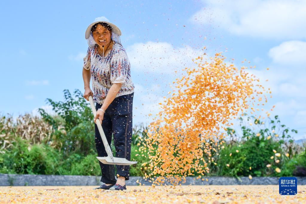 9月5日,村民在贵州省毕节市百里杜鹃管理区中塘村广场晾晒农作物。
