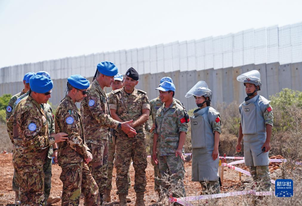 9月4日,在黎巴嫩南部“蓝线”附近雷场,联合国驻黎巴嫩临时部队(联黎部队)西区司令乔瓦尼·布拉法准将(左三)与中国第21批赴黎维和部队扫雷官兵交流。