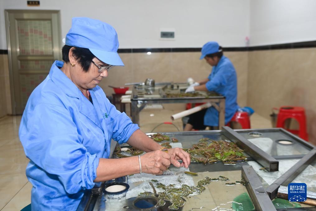 9月5日,在建德市航头镇乌龙村西湖莼菜产业园的车间内,工人在分拣刚刚采摘的莼菜。