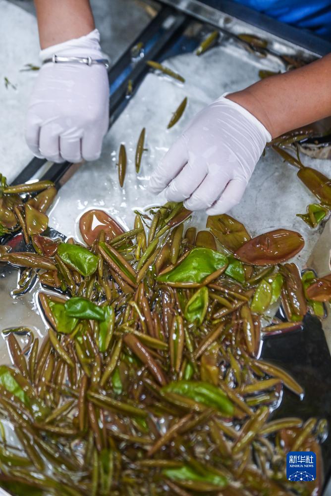 9月5日,在建德市航头镇乌龙村西湖莼菜产业园的车间内,工人在分拣刚刚采摘的莼菜。