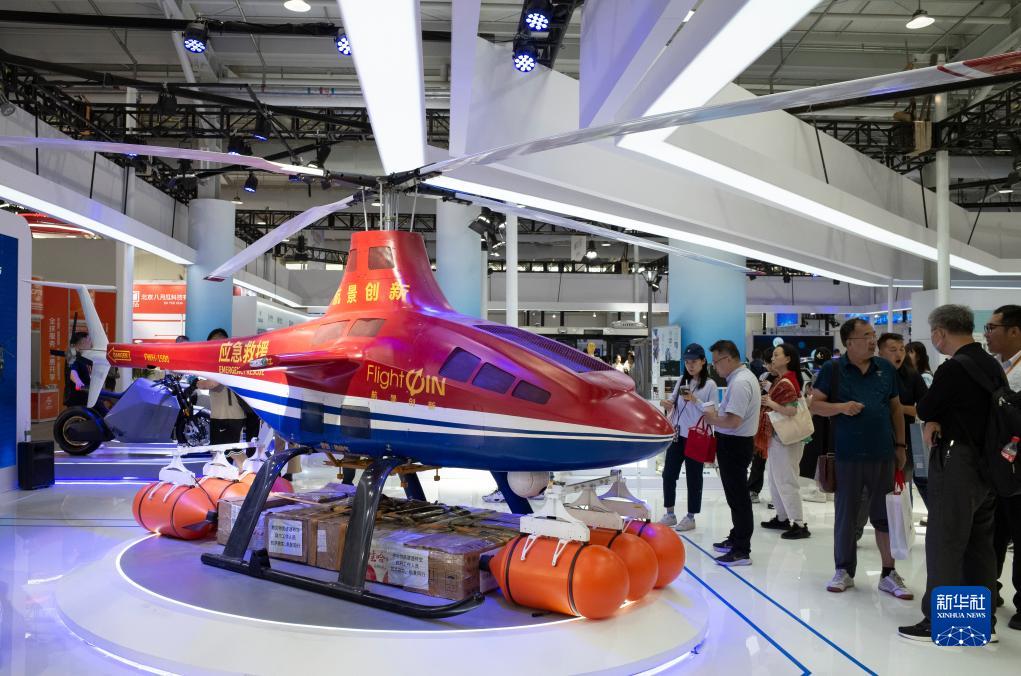 9月5日,观众在服贸会首钢园区的中关村科技园房山园展台了解一款无人直升机。