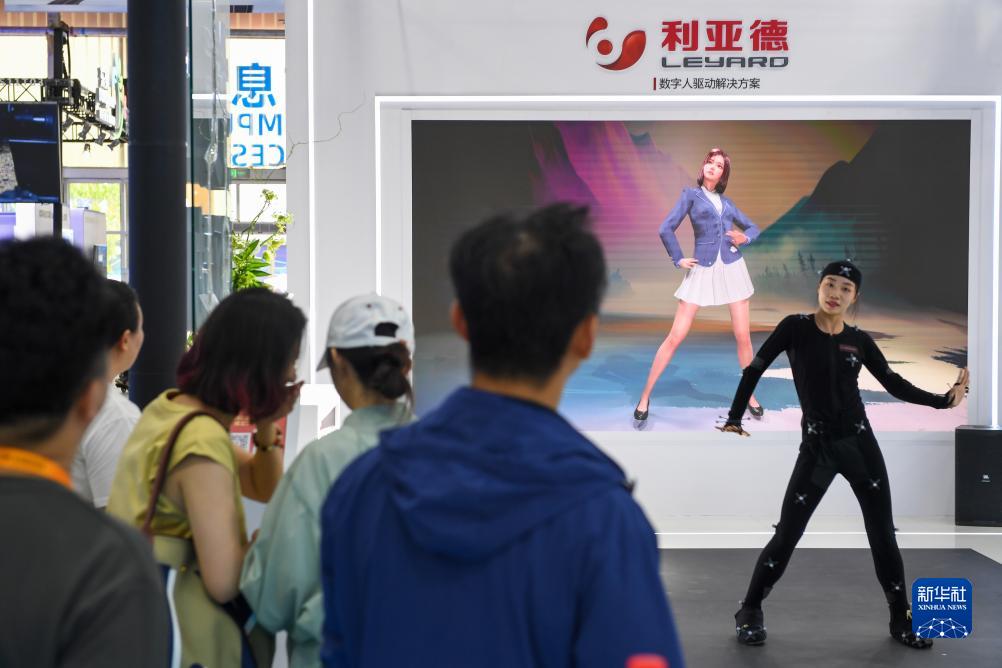 9月5日,在服贸会首钢园区的电信、计算机和信息服务专题展内,参观者观看一家企业的数字人驱动解决方案演示。