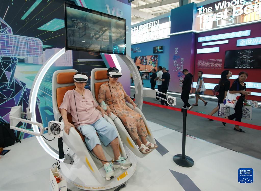 9月5日,参观者在服贸会首钢园区的文旅服务专题展内体验一款VR观影设备。