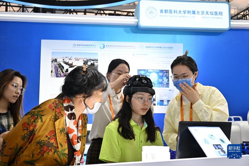 9月5日,在服贸会首钢园区,参观者在首都医科大学附属北京天坛医院展台体验国产的脑机接口系统。该系统用于运动障碍患者的主动康复训练。
