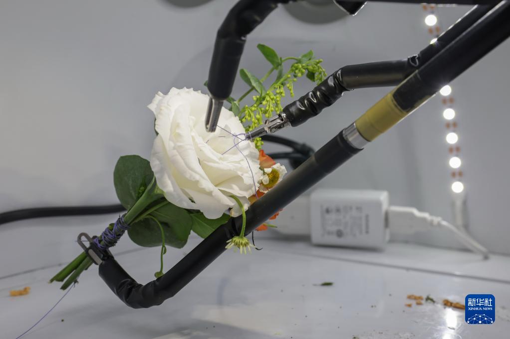 9月4日,在服贸会首钢园区北京友谊医院展台,图迈单臂腔镜手术机器人用手术线打结。