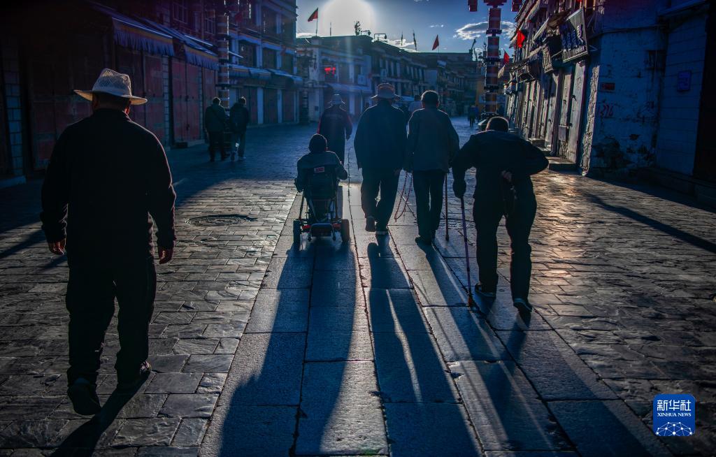 拉巴顿珠(骑电动轮椅车者)在清晨的八廓街(9月3日摄)。