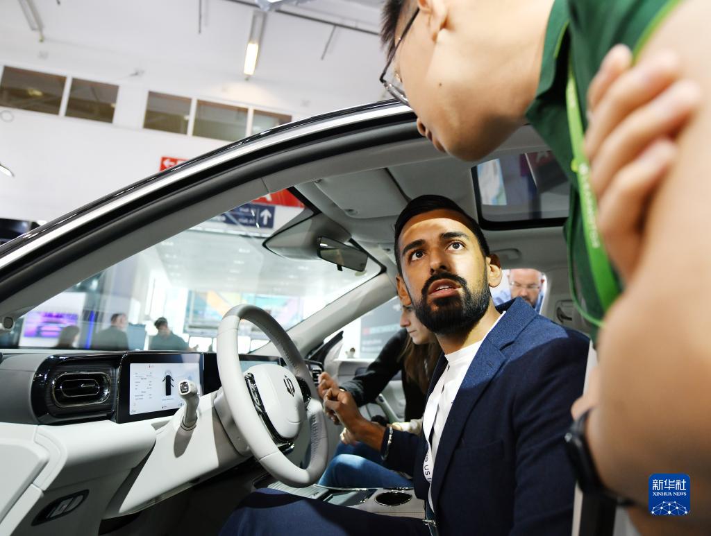 9月5日,在德国慕尼黑,参观者在德国国际汽车及智慧出行博览会的零跑汽车展区与工作人员交流。