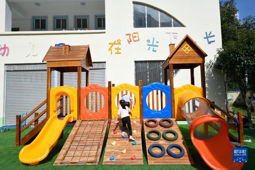 9月4日,小朋友在泸定县德威镇幼儿园玩耍。