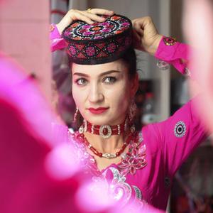 在新疆塔什库尔干塔吉克自治县帕米尔旅游区游客服务中心,县文工团演员唱歌跳舞欢迎游客(9月4日摄)。