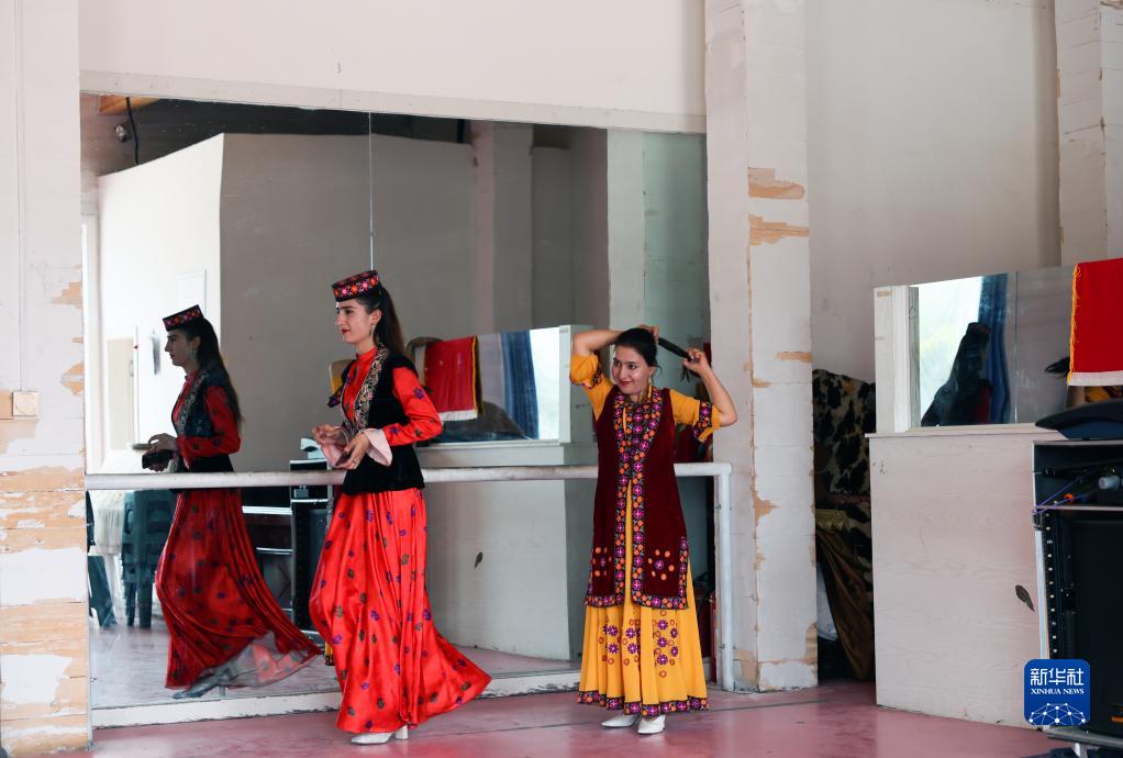 在新疆塔什库尔干塔吉克自治县帕米尔旅游区游客服务中心,县文工团演员在演出前做准备(9月4日摄)。
