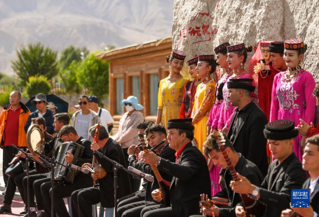 在新疆塔什库尔干塔吉克自治县帕米尔旅游区游客服务中心,县文工团演员唱歌跳舞欢迎游客(9月4日摄)。