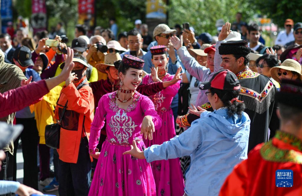 在新疆塔什库尔干塔吉克自治县帕米尔旅游区游客服务中心,县文工团演员与游客共舞(9月4日摄)。