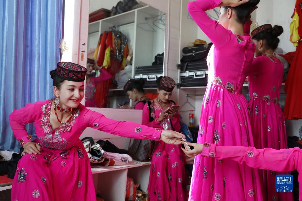 在新疆塔什库尔干塔吉克自治县帕米尔旅游区游客服务中心,县文工团演员在演出前做准备(9月4日摄)。