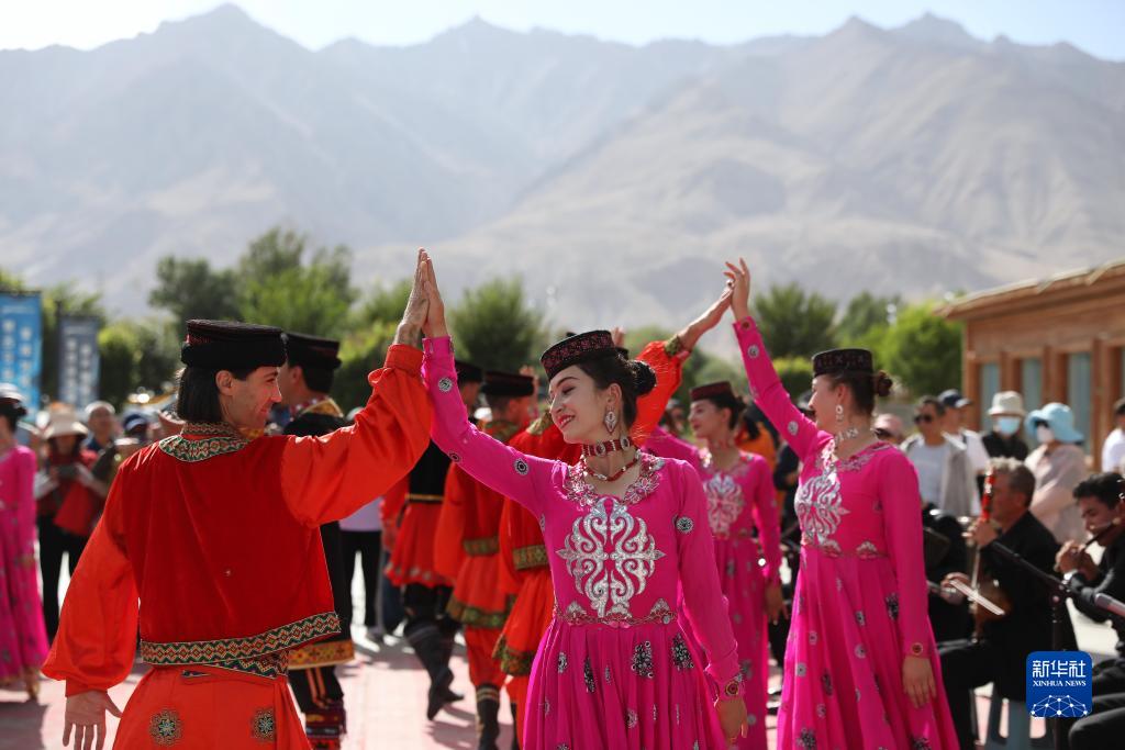 在新疆塔什库尔干塔吉克自治县帕米尔旅游区游客服务中心,县文工团演员跳舞欢迎游客(9月4日摄)。