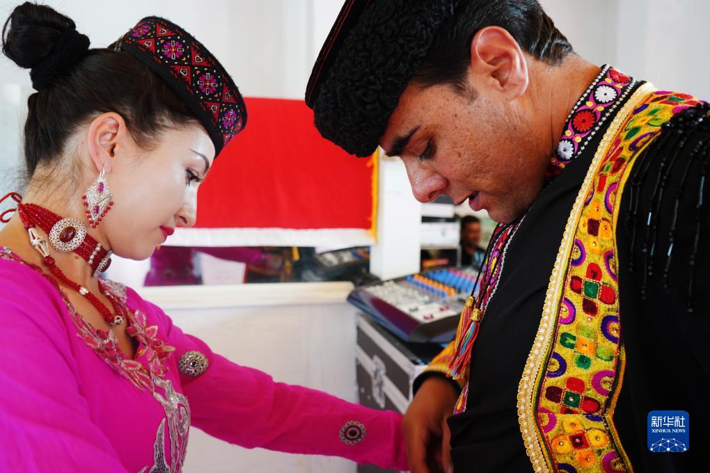 在新疆塔什库尔干塔吉克自治县帕米尔旅游区游客服务中心,县文工团演员在演出前做准备(9月4日摄)。