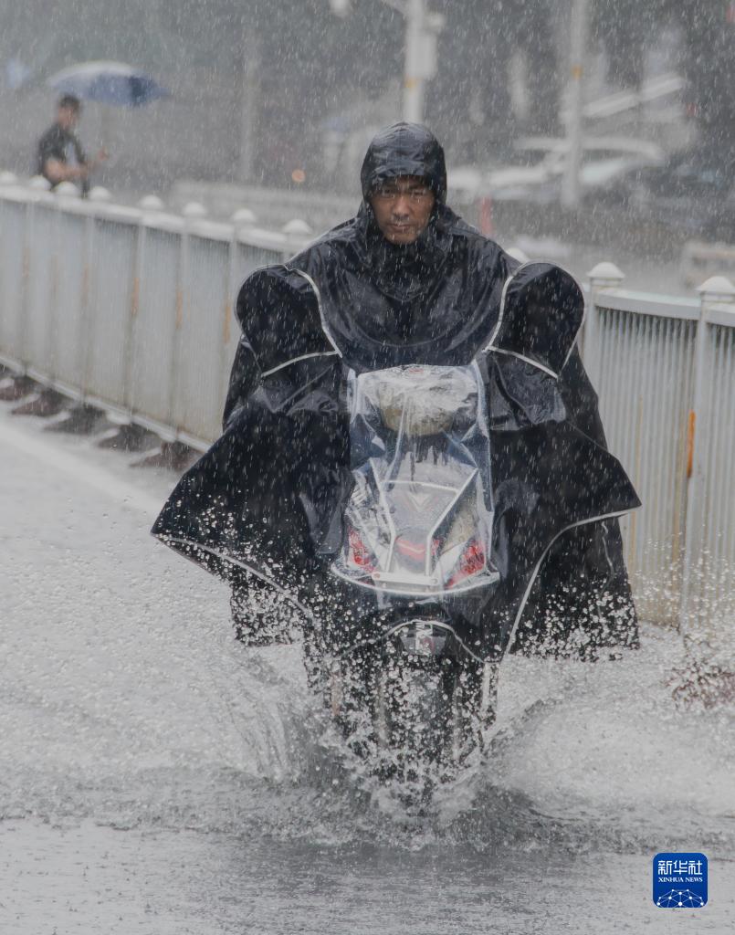 9月6日,市民冒雨骑行在福州市晋安区福新路上。