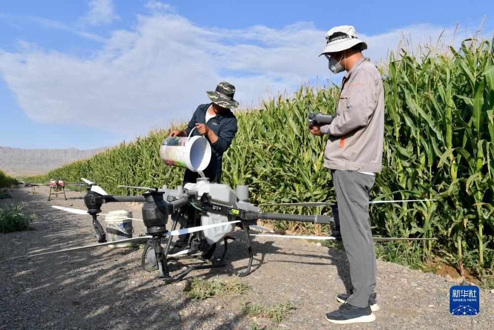9月5日,在山丹县位奇镇十里堡村,技术人员开展“一喷多促”准备工作。
