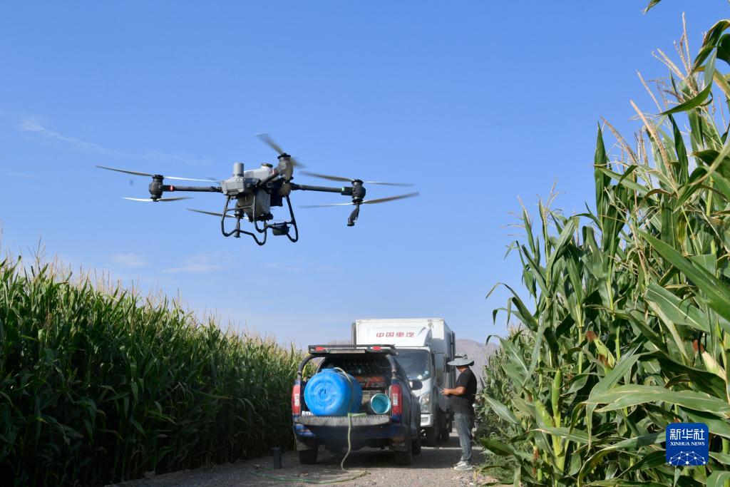 9月5日,在山丹县位奇镇十里堡村,技术人员开展“一喷多促”作业。
