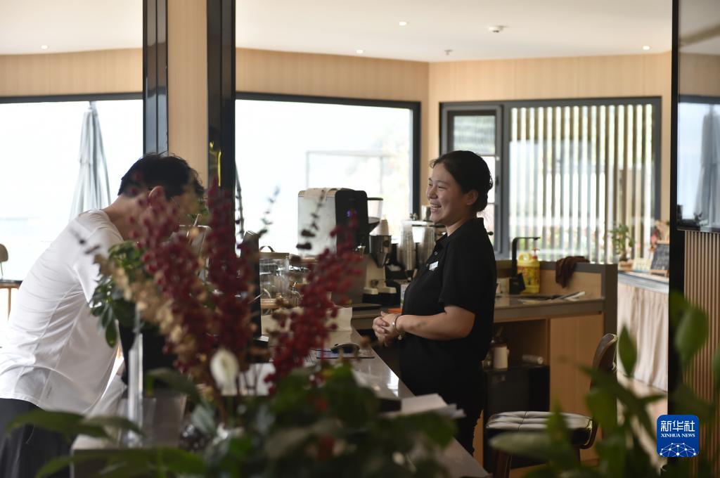 9月5日,林州市石板岩镇一家“乡村振兴”公益项目民宿的工作人员(右)在接待来访者。