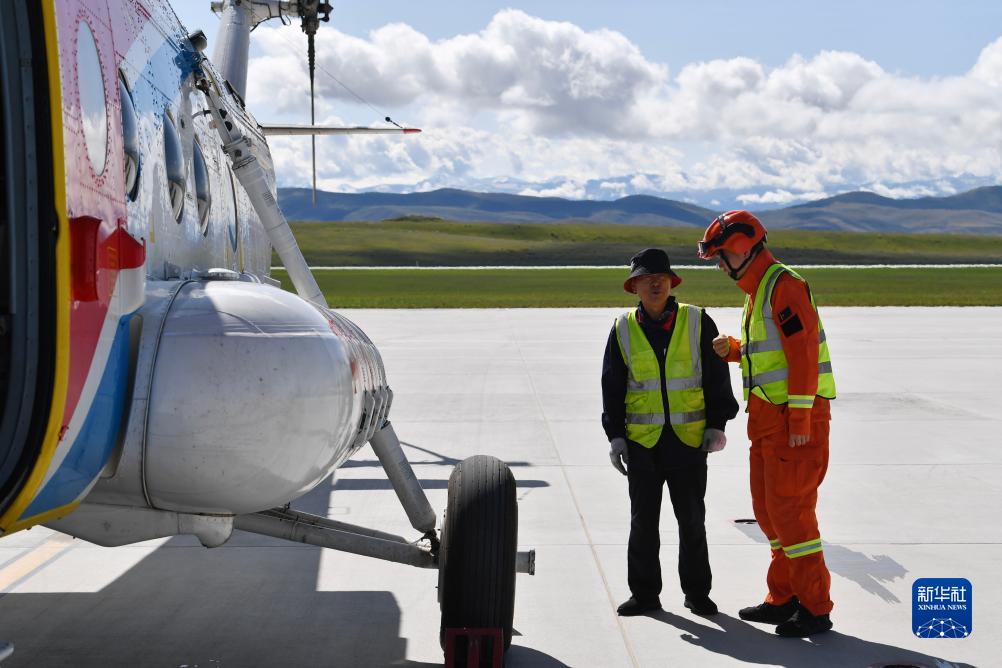 新疆伊犁哈萨克自治州森林消防支队指战员孙瑜与飞行机组工作人员讨论航空巡护事宜(9月5日摄)。