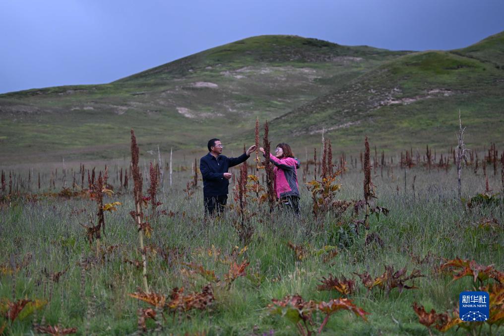 9月5日,中国科学院西北高原生物研究所副研究员杨路存(右)在果洛藏族自治州甘德县岗龙乡一处“草药间种”的黑土滩治理试验田中收集唐古特大黄种子。