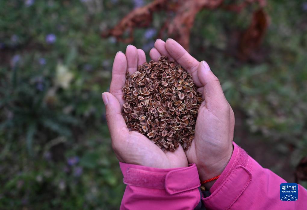 9月5日,中国科学院西北高原生物研究所副研究员杨路存在果洛藏族自治州甘德县岗龙乡一处“草药间种”的黑土滩治理试验田展示当地道地药材唐古特大黄的种子。