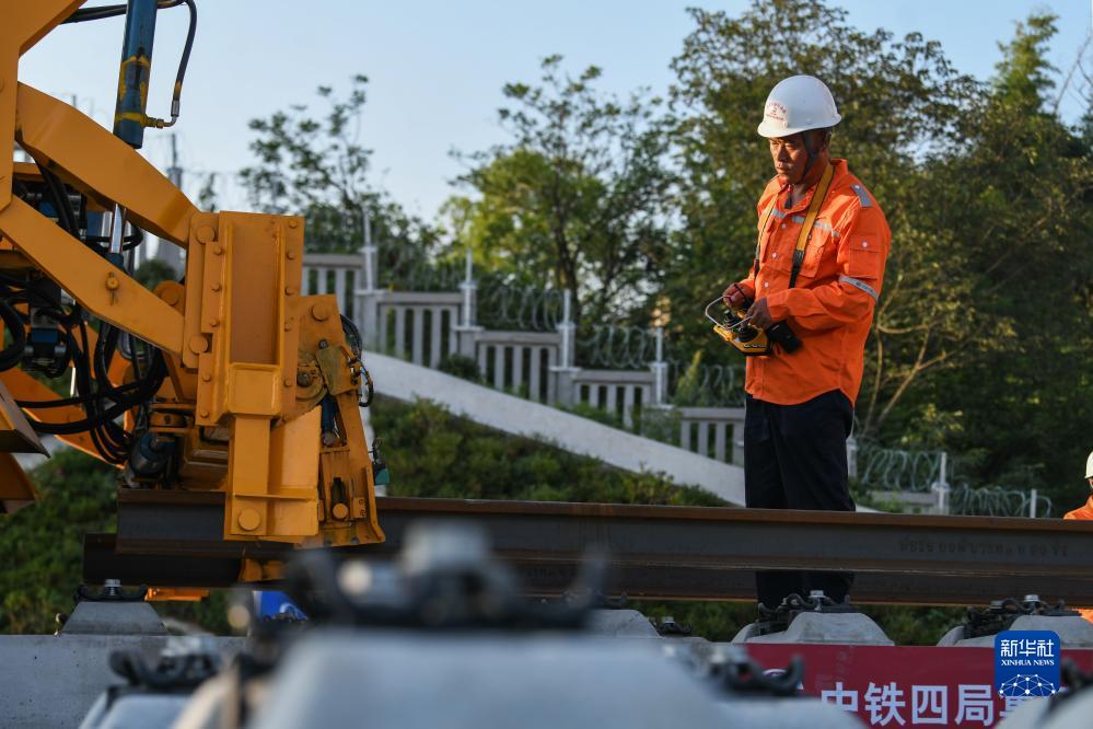 9月6日,在四川省泸州市冯湾特大桥施工现场,技术人员在操纵智能铺轨机进行铺轨施工。