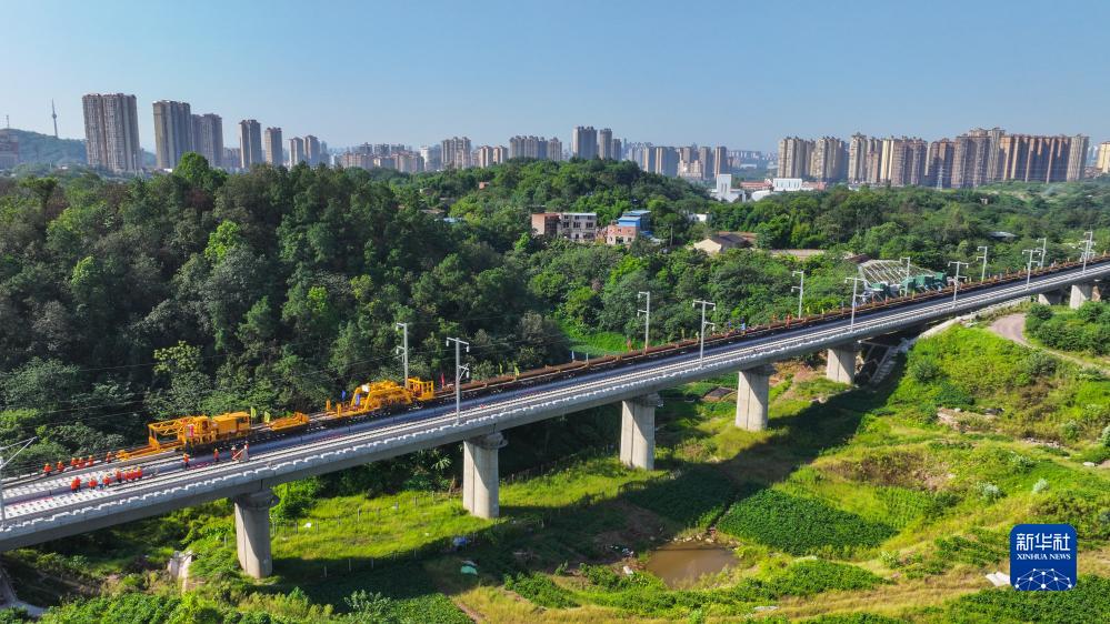 这是9月6日在四川省泸州市冯湾特大桥拍摄的渝昆高铁川渝段铺轨施工现场(无人机照片)。