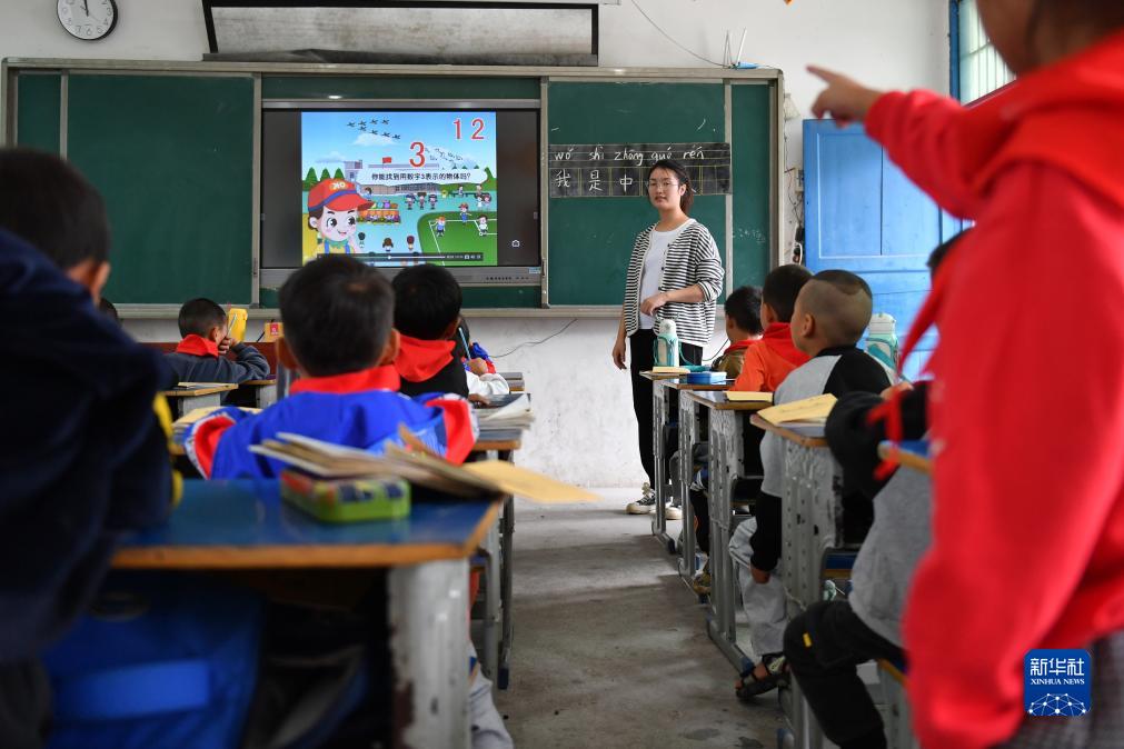 9月4日,报木小学的老师刘凤英在给一年级和三年级的学生上课。