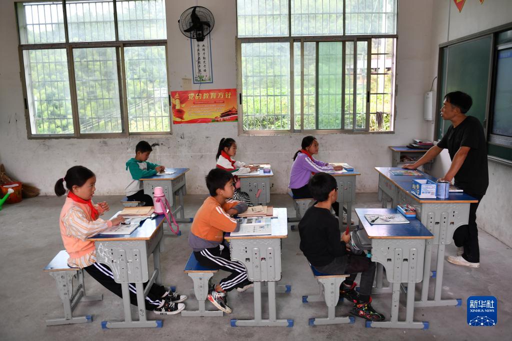 学校的主心骨是1985年就来这里任教的校长段同山,曾经最困难的时候只有他一个老师和十几个学生。如今曾在报木小学就读、大学毕业后回来任教的刘凤英,和今年刚从师范学校毕业的“00后”罗潇一起采用复式教学的形式,为45个学生开展日常教学、文娱活动等。