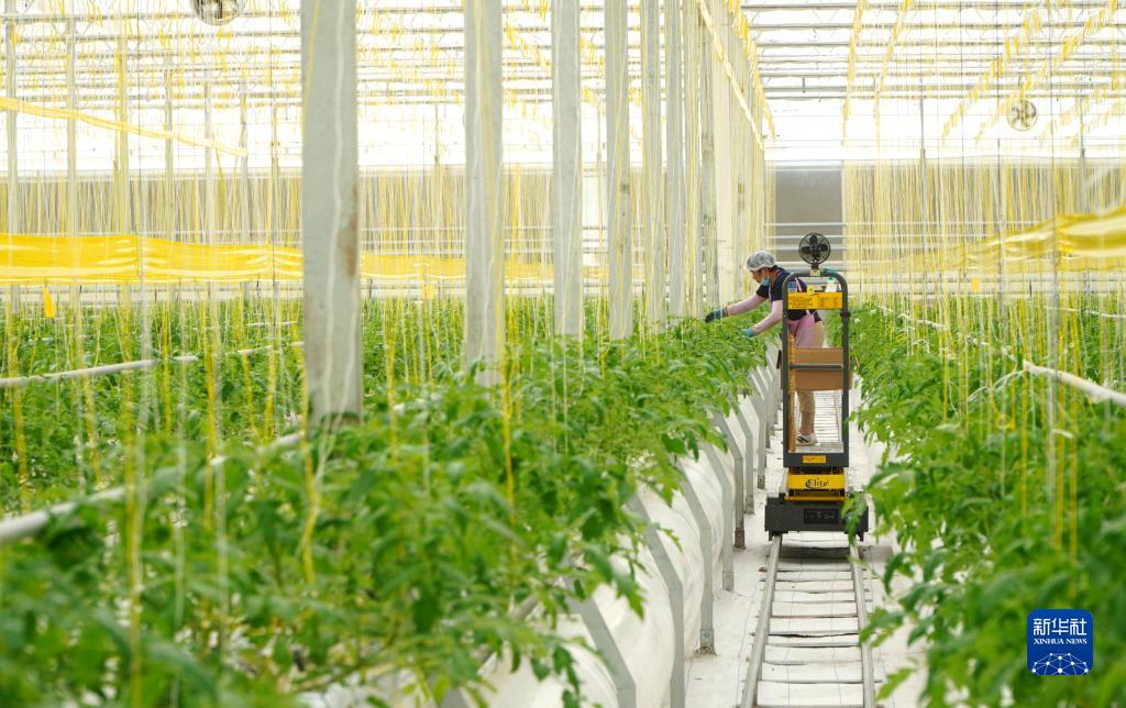 9月6日,在山东省昌邑市饮马镇,蔬菜种植户在高标准种植大棚里培育西红柿秧苗。