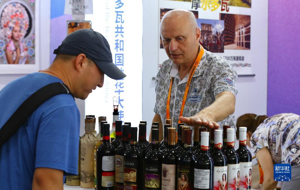 9月6日,参观者(左)在在服贸会文旅服务专题展了解摩尔多瓦葡萄酒。